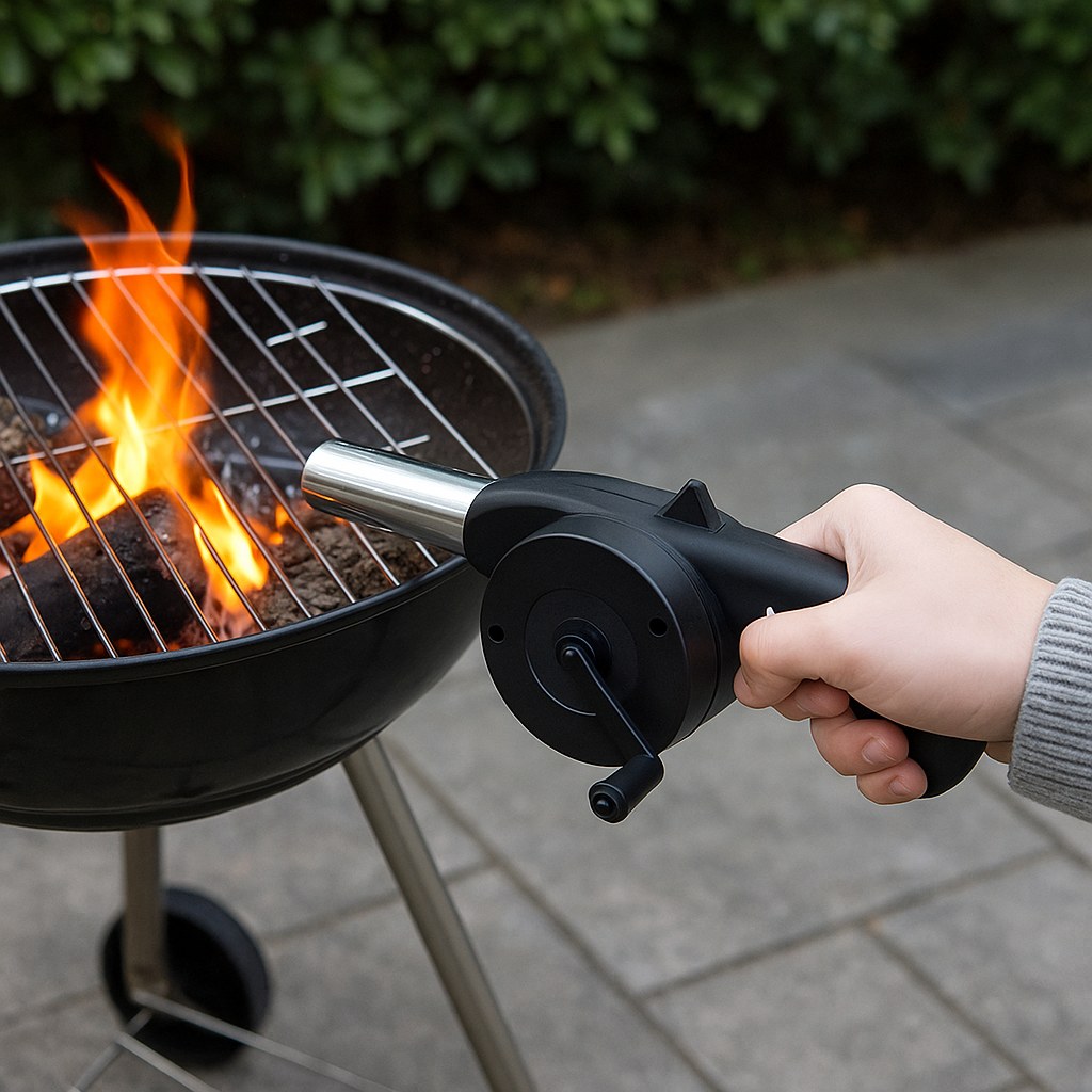 This manual fan works anywhere—no power, gas, or fuel required. Just turn the handle to direct airflow where you need it, making lighting a fire simple, safe, and efficient.