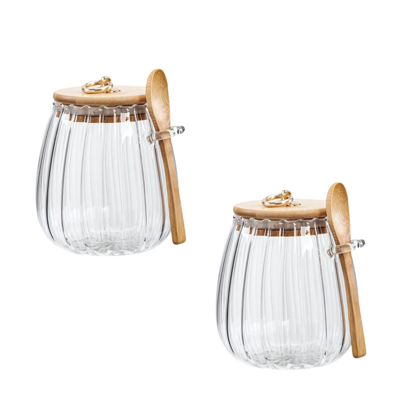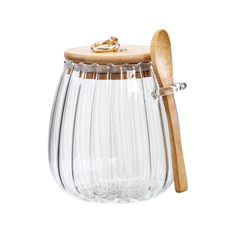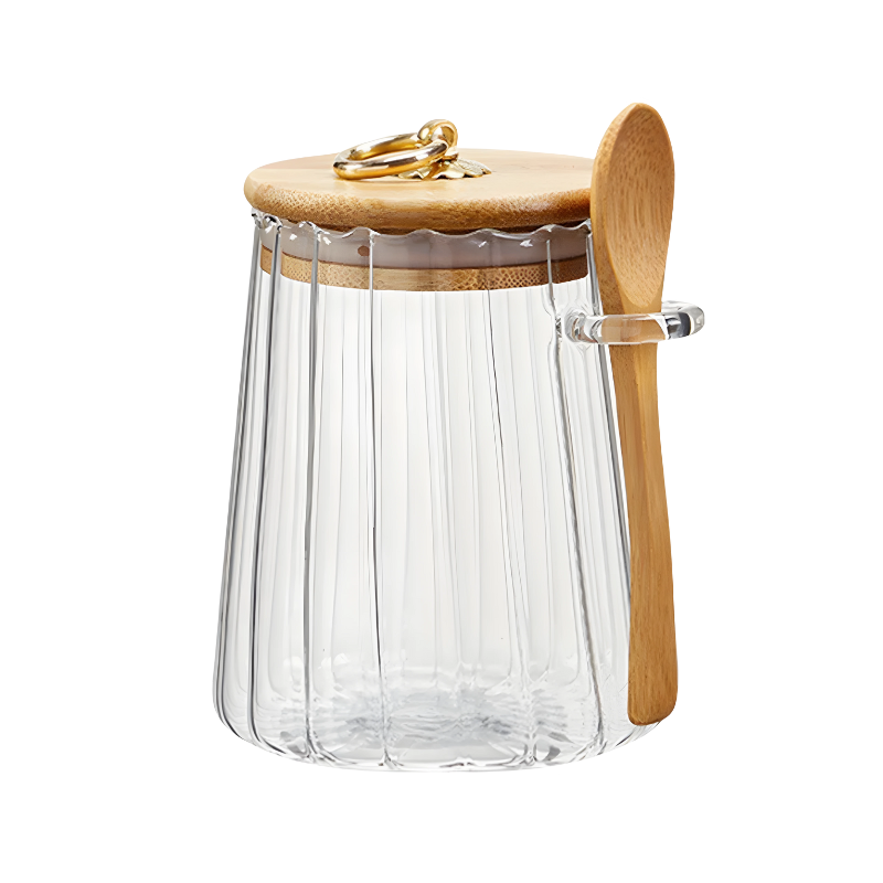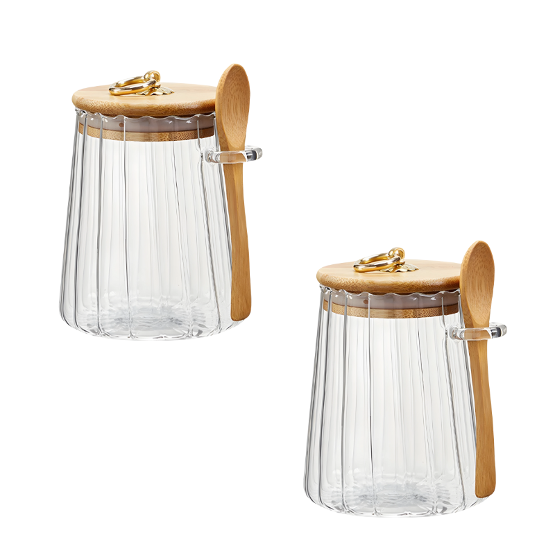 Having everything at hand simplifies cooking and baking. The clear glass allows for effortless visibility of the contents. Additionally, the included wooden spoon adds both practicality and aesthetic appeal.
