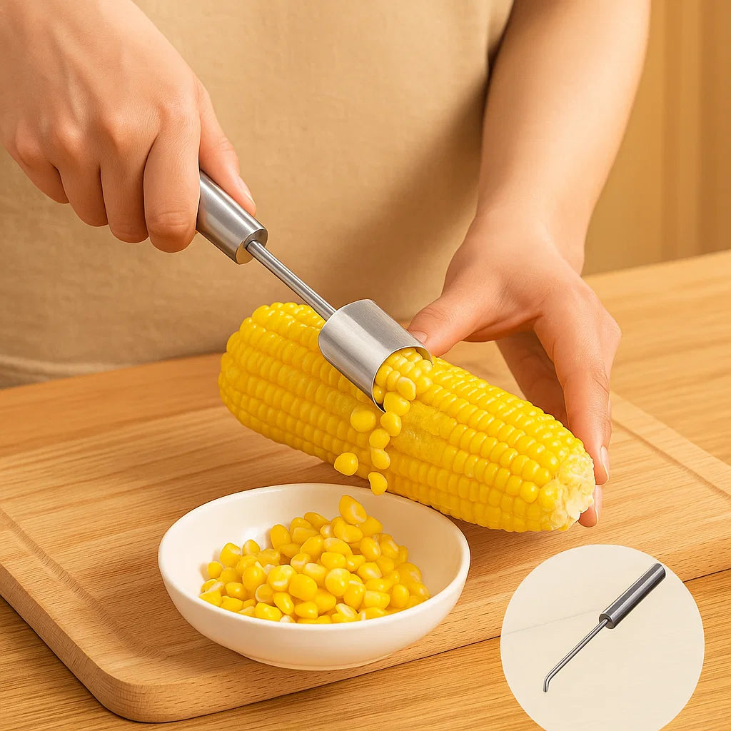 Enjoy fast, mess-free corn preparation with CornEase, the kitchen tool designed to strip kernels quickly and safely. Its curved stainless steel blade hugs the cob perfectly, making it easy to remove kernels with a simple push-down motion.
