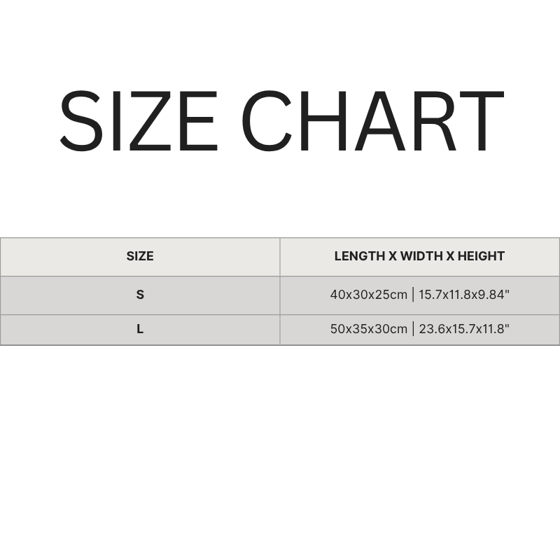 - Available Sizes: S (40x30x25 cm | 15.74x11.81x9.84") , L (50x35x30 cm | 19.68x13.77x11.81")