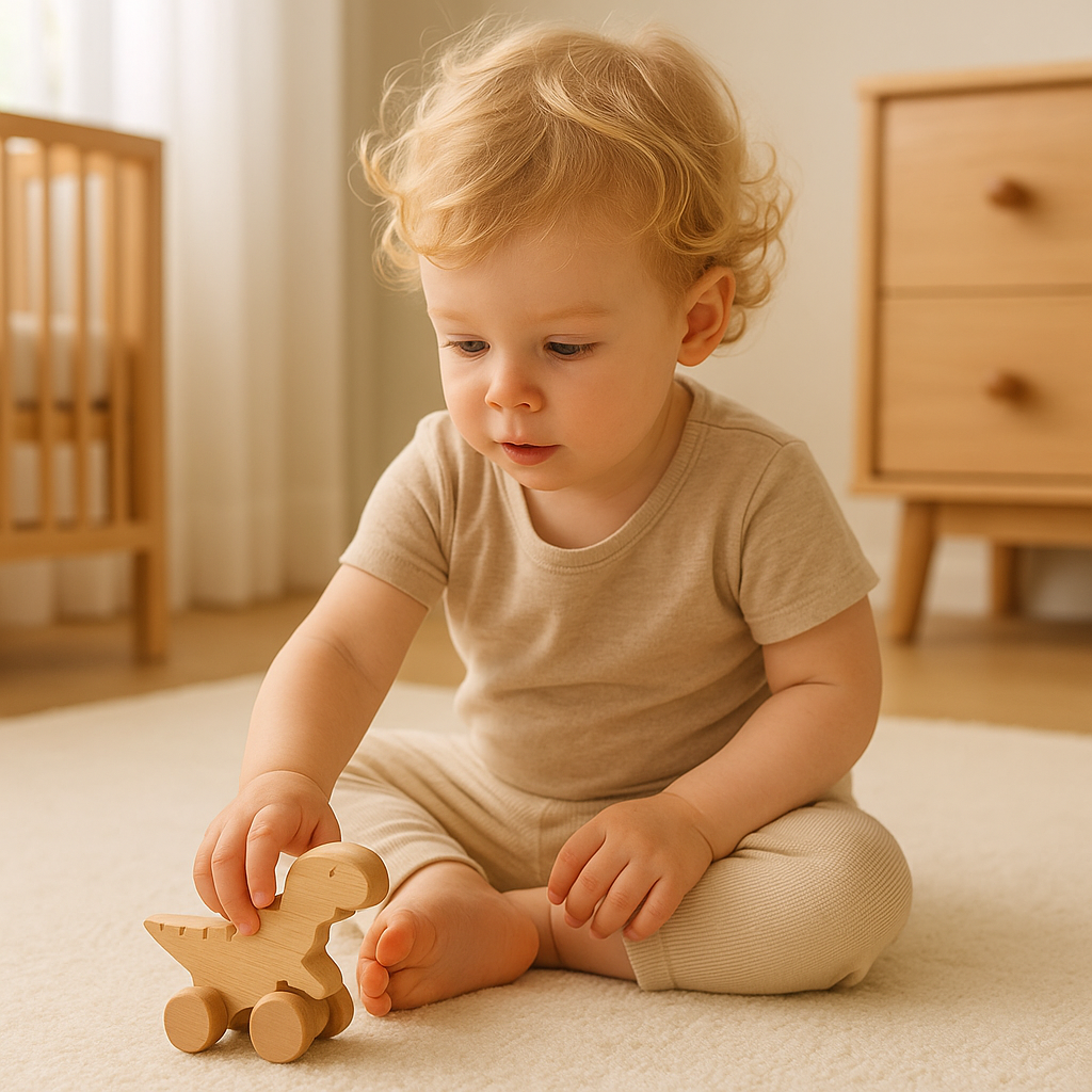 The wooden dino car is gentle on my baby’s gums and provides hours of entertainment.