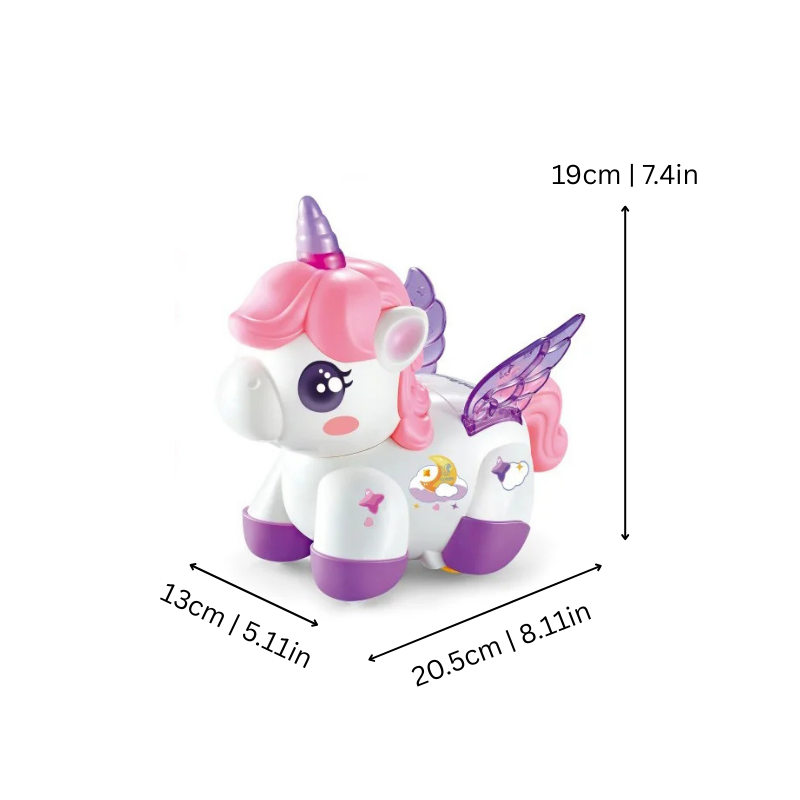 Frolicra boasts fluid 360° rotation and whimsical walking actions that effortlessly capture children's attention. As it twirls and glides, vibrant LED lights sparkle and joyful sounds resonate, forming an immersive play atmosphere that feels dynamic and exhilarating. The unicorn's charming design and animated movements keep kids fascinated, entertained, and eager to join in the fun.