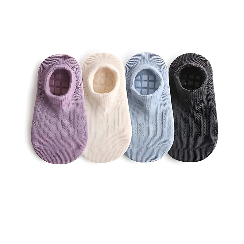 I was looking for a minimalist baby sock that wouldn’t slide off constantly, and these fit the bill. They have just enough grip to keep my toddler safe while walking indoors, and they don’t leave red marks around the ankle. We've washed them several times and they’ve held up beautifully.