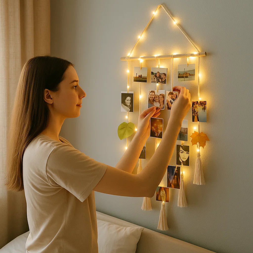 Made from natural cotton rope, LumaFrame combines rustic appeal with lasting quality. It’s easy to hang, simple to update with new pictures, and ideal for bedrooms, living rooms, or special events.