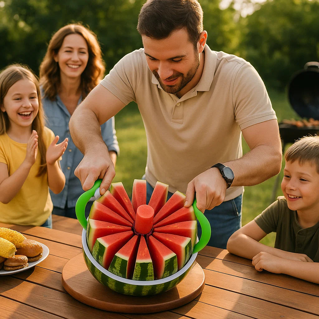 This watermelon cutter cuts even slices. I did have to cut my watermelon in half, to make it easier for me to cut. Twice as many slices👍