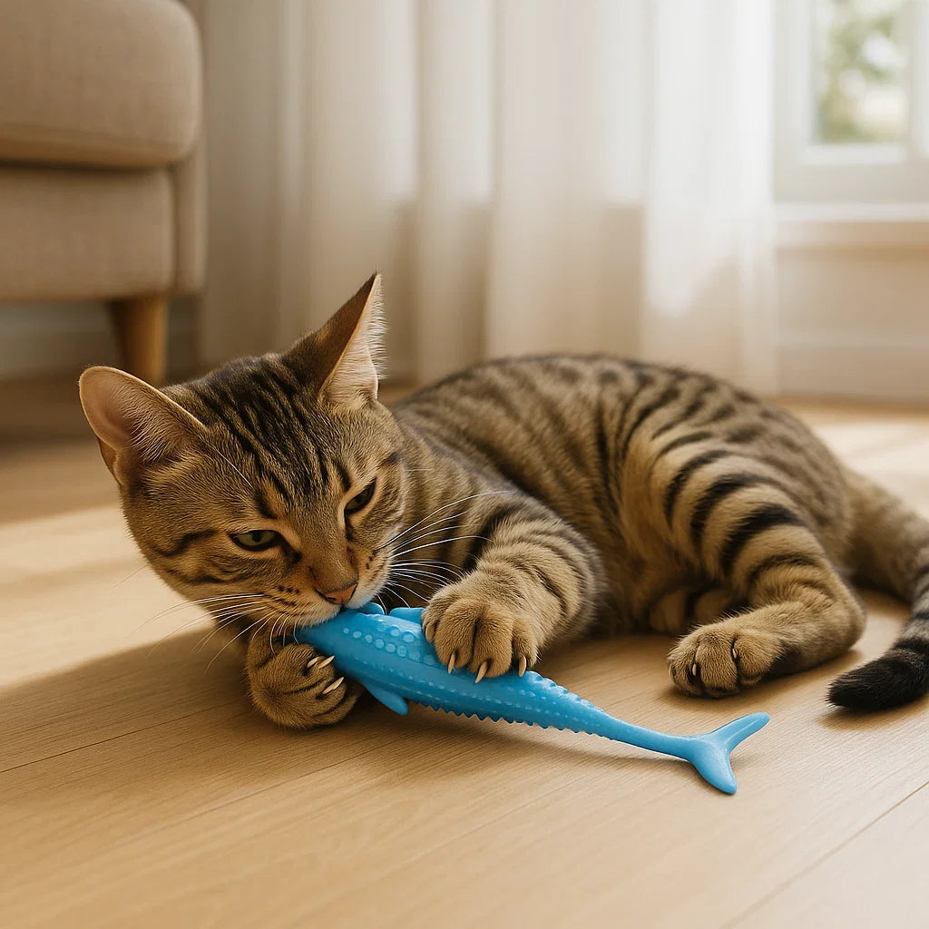 This fish toy was an instant success in our home. My kitten is in full teething mode, and she gnaws on this like it’s her job. The soft, chewy silicone gives her comfort and keeps her from chewing cords or shoes.