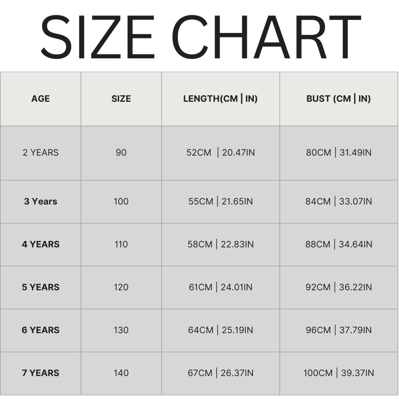 - Available Sizes, 90 (2 Years), 100 (3 Years), 110 (4 Years), 120 (5 Years), 130 (6 Years), 140 (7 Years)