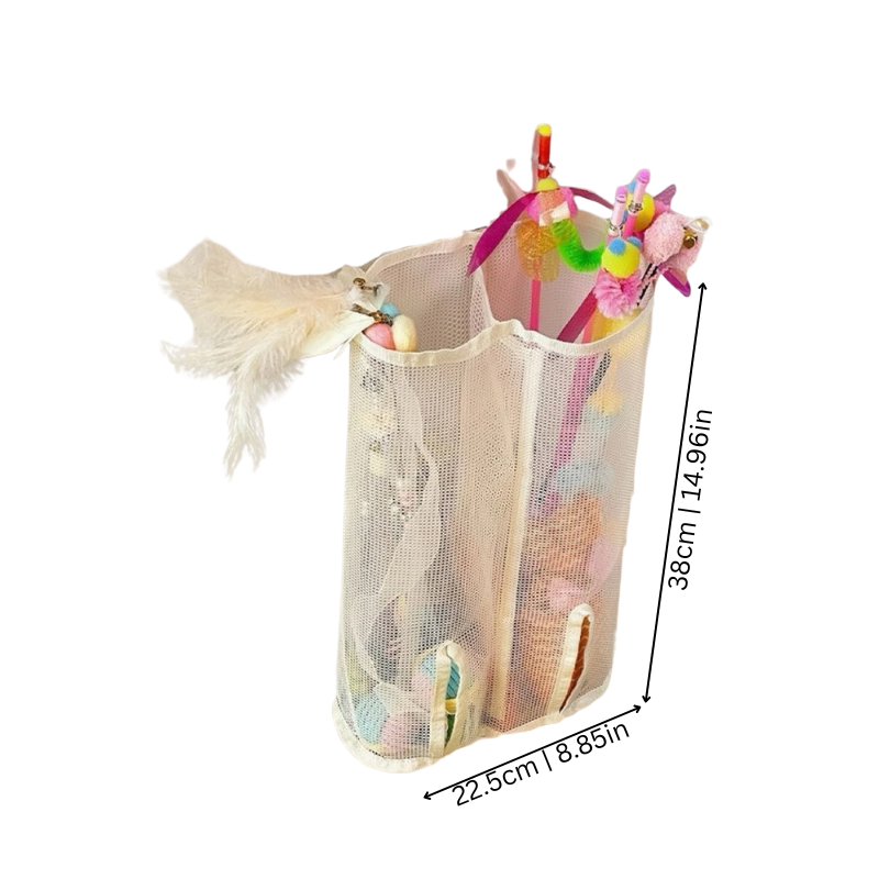 Declutter your pet's play area in moments with Pawzari—a self-adhesive mesh storage solution designed to keep your cat and puppy toys off the ground, optimize space in compact areas, and streamline playtime spontaneity.