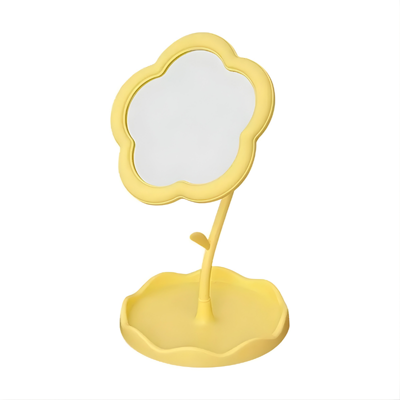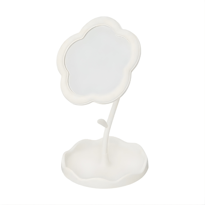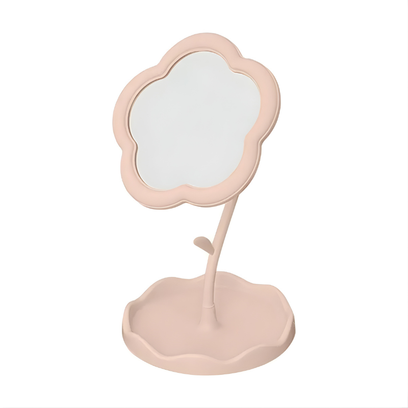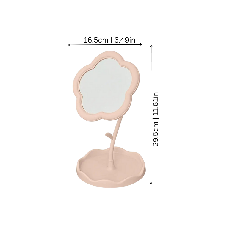this mirror is so adorable! The flower shape adds a touch of whimsy to my vanity, and the tray base is super handy for holding little items like rings or lip balms.