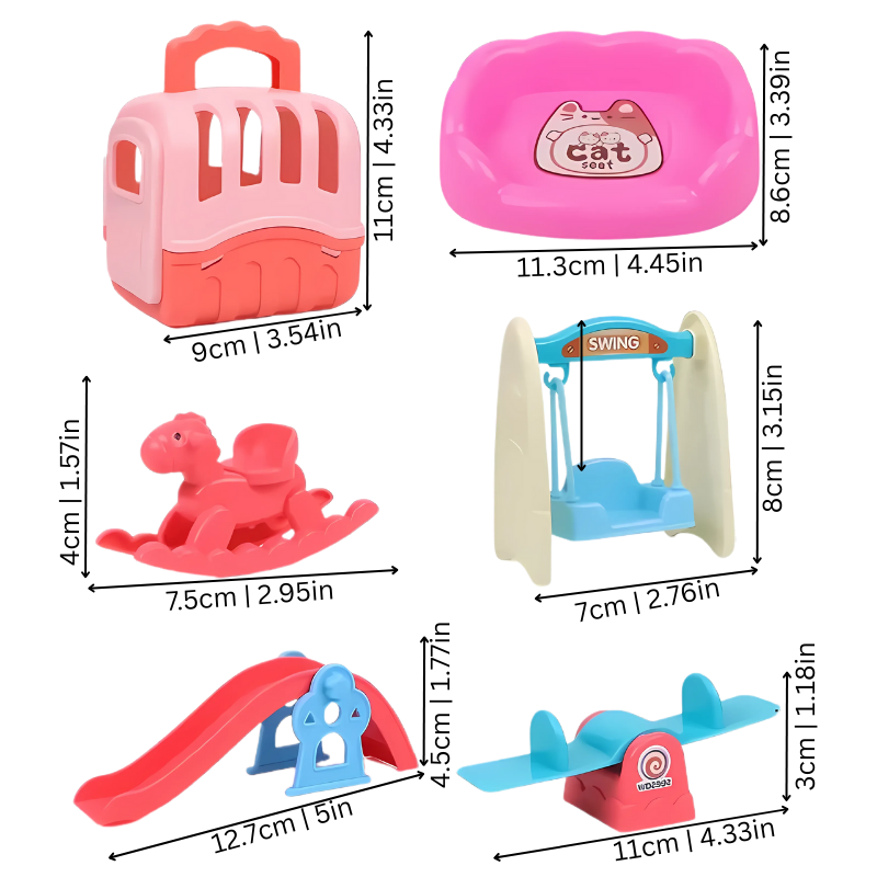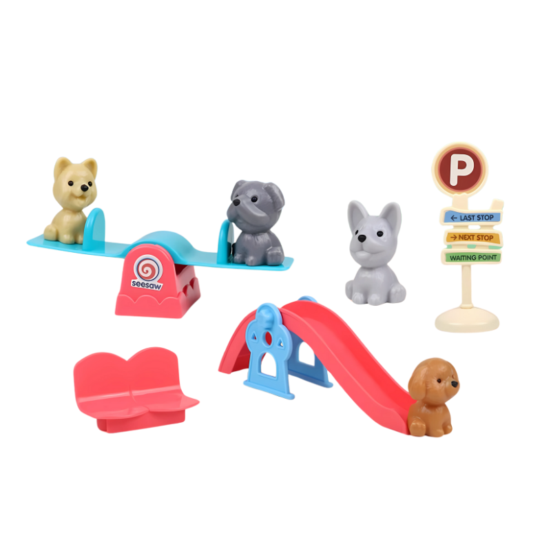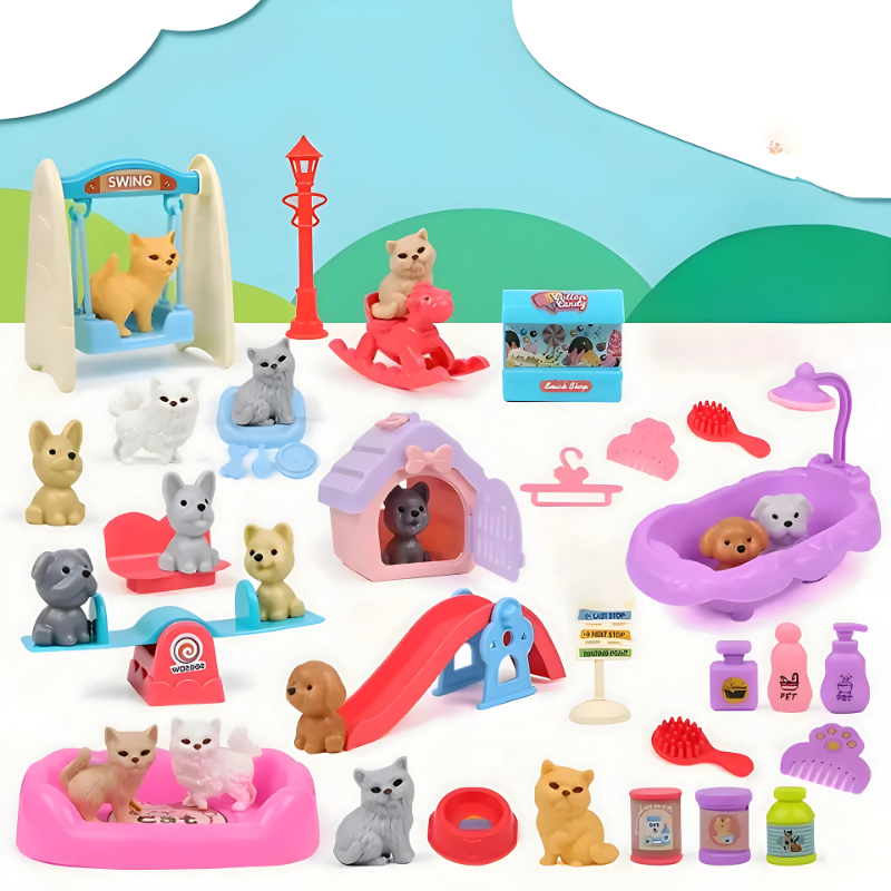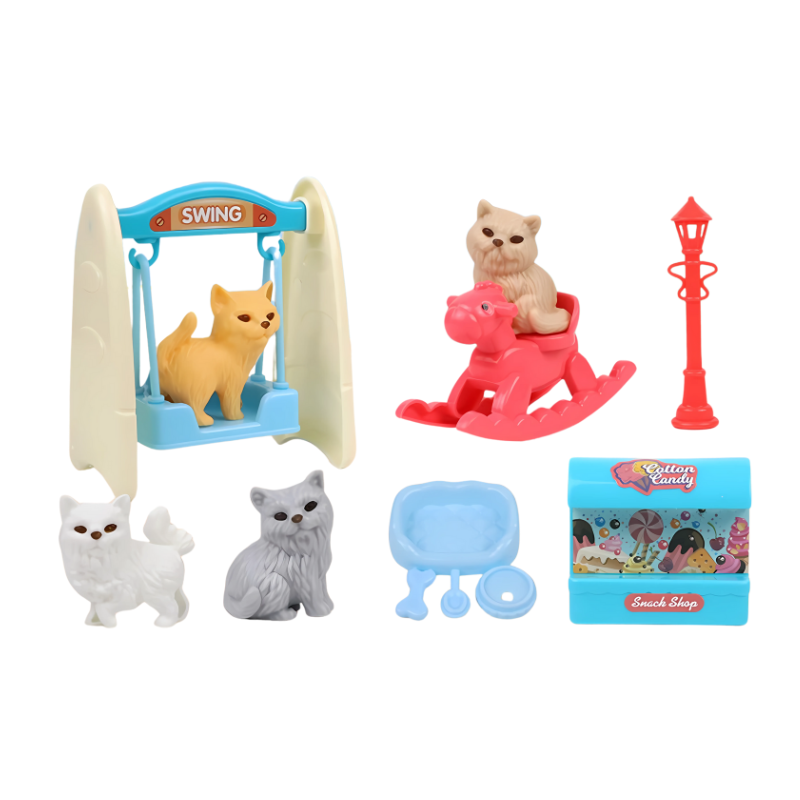 - Available Set: 8pcs Dog Slide, 8pcs Blue Dog, 8pcs Pink Dog, 9pcs Cat Swing, 13pcs Dog Bathroom