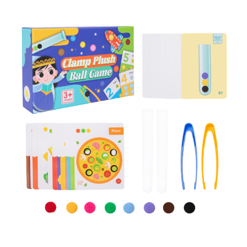 My daughter loves this pom pom set. She uses the tweezers and matches colors all by herself. It’s helping her with focus and hand strength.