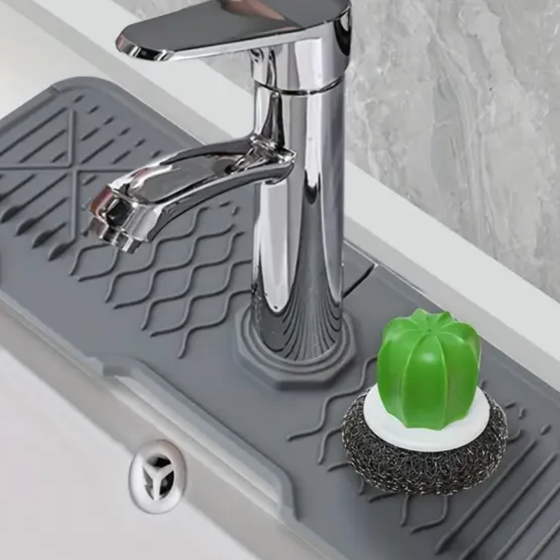 Maintain a tidy sink area with Rinsify—an uncomplicated, delightful kitchen accessory that captures splashes, directs drips back into the basin, and provides a tidy space for everyday items without the need for frequent wiping.