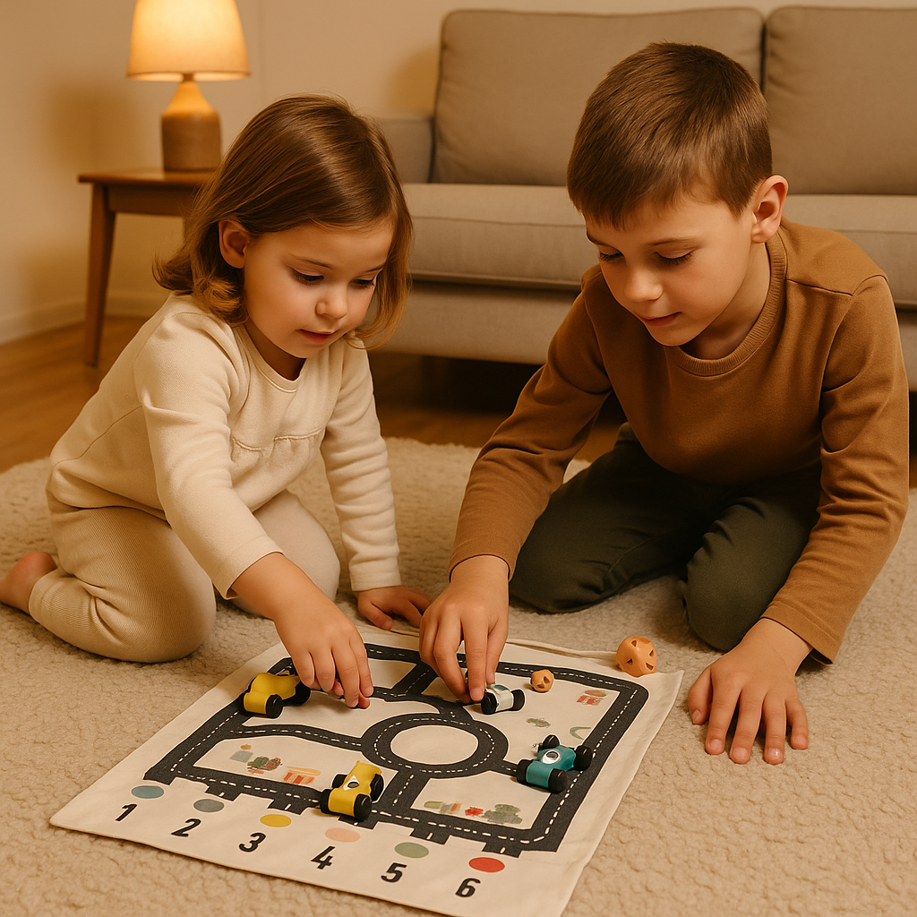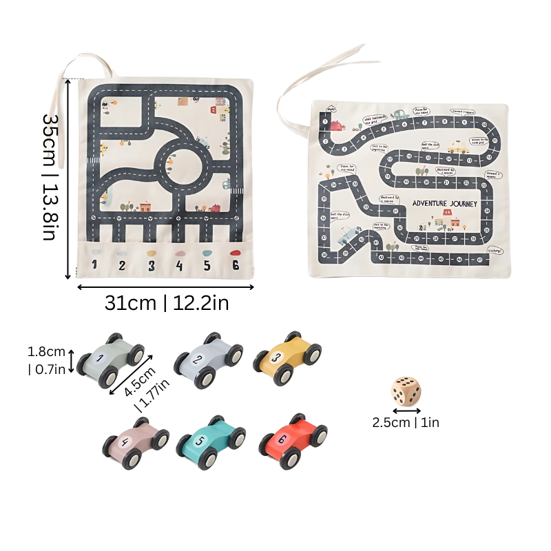 Every piece of RoadQuest is designed for smooth play and durability. The wooden cars glide effortlessly over the sturdy canvas track, making it easy for little ones to control. As they play, they naturally build fine motor skills and learn basic principles of motion and speed.