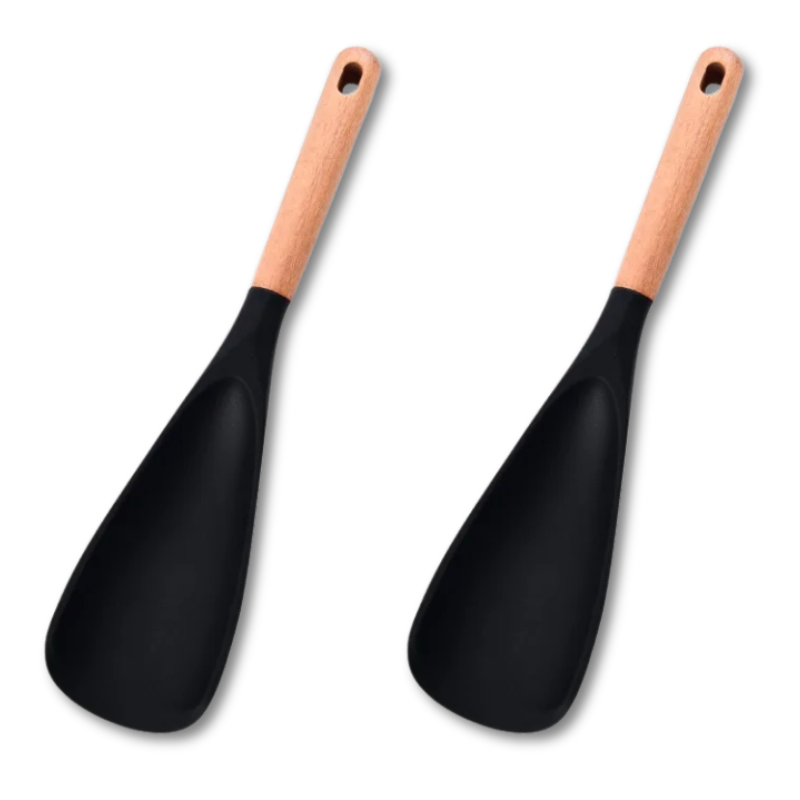 love the mix of style and function here, the handle has a natural feel and the silicone is strong without being too stiff. i’ve used them for sautéing, folding batter, even cooking sticky rice. zero warping or smell after multiple uses