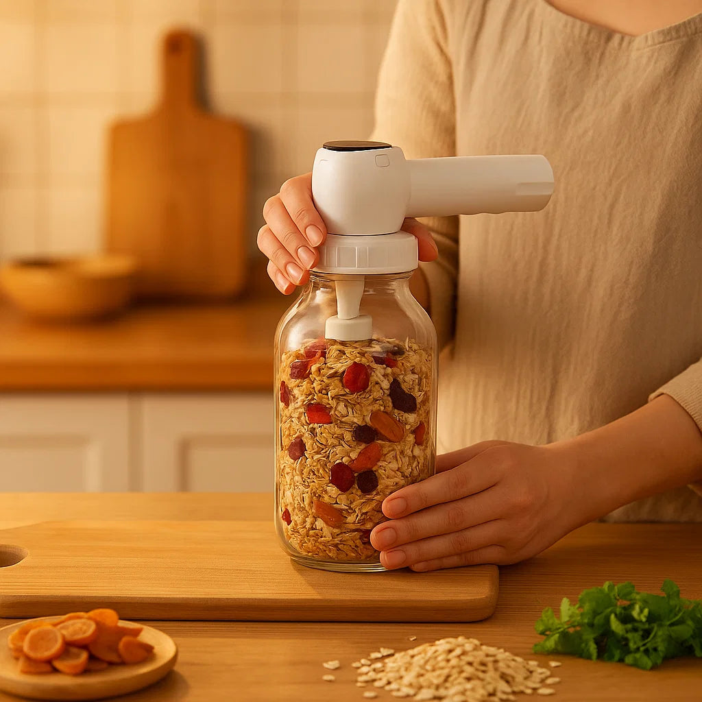 Switch between attachments for wide or regular mouth jars, then use it with bags or boxes for bulk storage. It’s a single tool that handles all your sealing needs without the clutter of multiple gadgets.