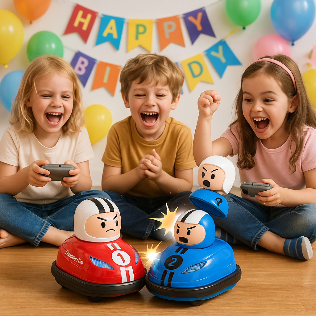 Players control their cars with simple remotes, steering, spinning, and crashing into each other until one driver is launched—creating excitement and laughter with every round.