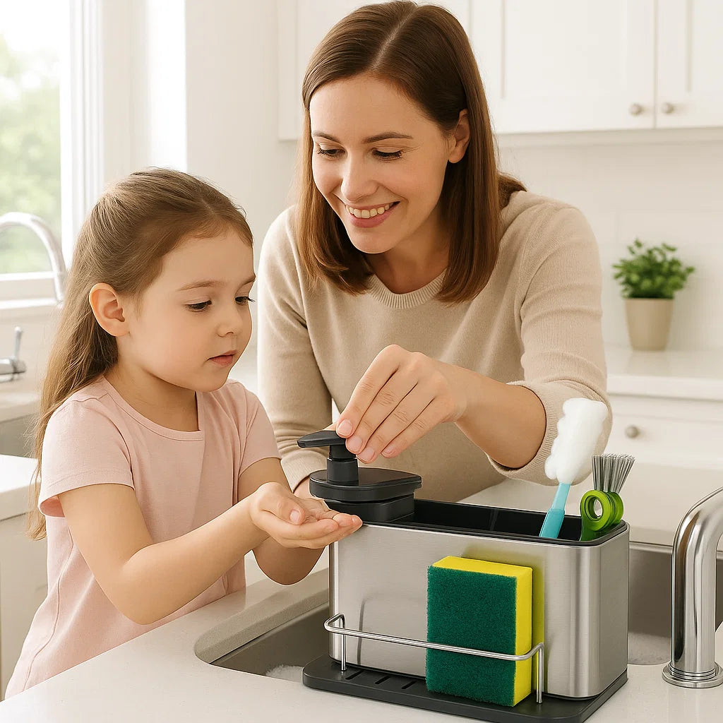 Keep your sink organized and your kitchen stylish with SoapDeck—a stainless steel organizer with a built-in soap dispenser that keeps sponges, brushes, and bottles neatly in place. It’s the perfect blend of practicality and design for a clutter-free countertop.