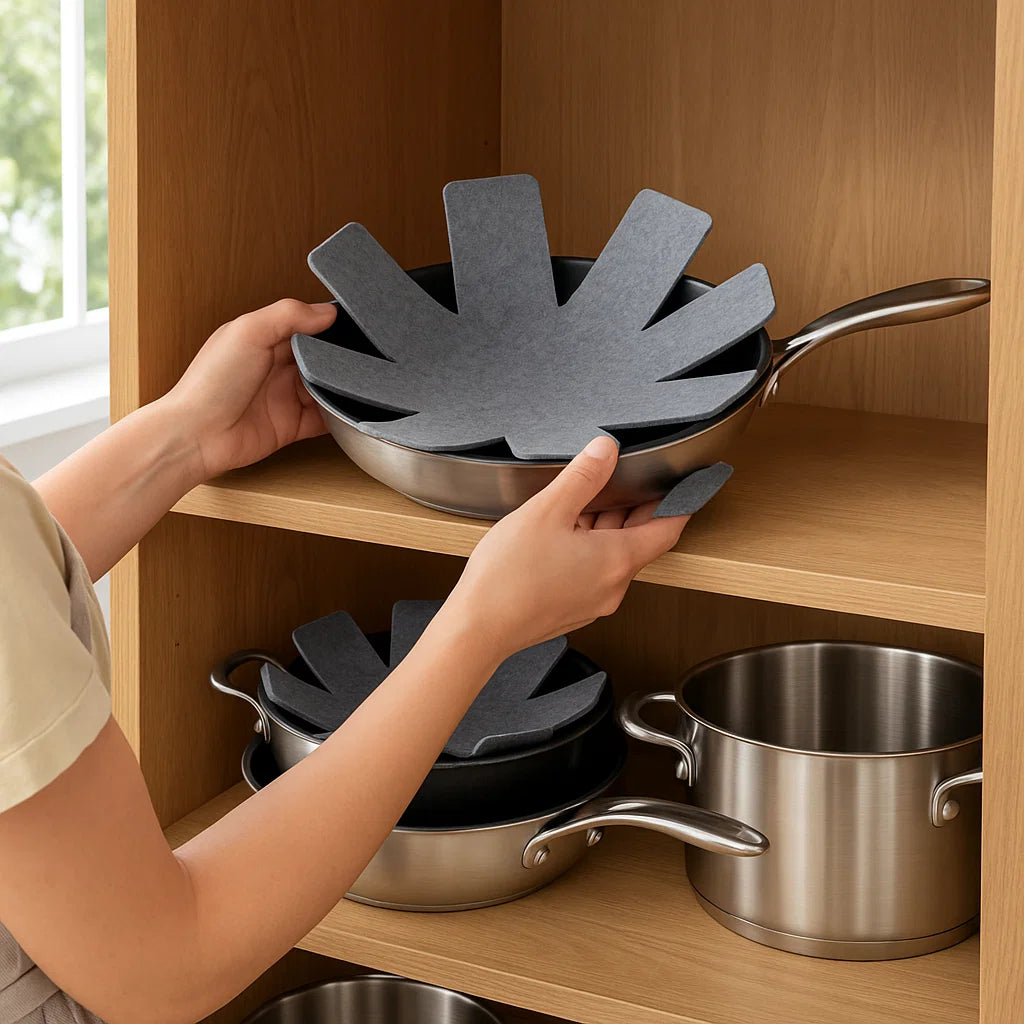 StackGuard slips effortlessly between cookware pieces, creating a soft barrier that stops surfaces from rubbing or scraping against each other. It’s an easy yet effective way to preserve the quality of your favorite kitchen tools, from delicate nonstick pans to heavy cast iron.